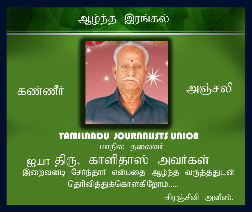 தமிழ்நாடு ஜர்னலிஸ்ட்ஸ் யூனியன் மாநிலத் தலைவர் ஐயா.திரு. காளிதாஸ் அவர்கள் இறைவனடி சேர்ந்தார் என்பதை ஆழ்ந்த வருத்தத்துடன் தெரிவித்துக் கொள்கிறோம்… இதன் அடையாளமாக தமிழ் மலர் மின்னிதழ் இன்று ஒரு நாள் இயங்காது என்பதை தெரிவித்துக்கொள்கிறோம்