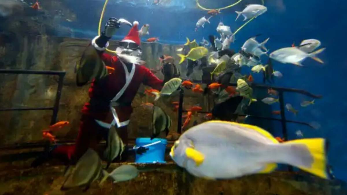 கிறிஸ்துமஸ் நெருங்குவதை முன்னிட்டு, ஒரு வித்தியாசமான சுவாரஸியமான நிகழ்வு அங்கே நடந்தேறியுள்ளது. கிறிஸ்துமஸ் தாத்தா சாண்டா கிளாஸ் நீர் மூழ்கி சாதனங்களை அணிந்துக்கொண்டு, பரிசுகள் நிறைந்த ஒரு சாக்கு மூட்டையுடன் அந்த நீர்த்தொட்டியில் இறங்குகிறார். இறங்கிய அவர், அங்கே சுற்றி வரும் பல வண்ண கடல் மீன்களுக்கு உணவளிக்க ஆரம்பிக்கிறார்.அவர் உணவளிக்க ஆரம்பித்தவுடன் அங்குள்ள மீன்கள் அவரிடம் பாய்ந்து வருகின்றன.