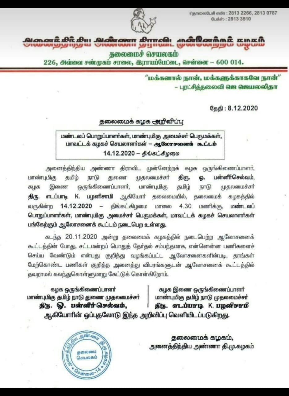 கே.பழனிசாமி ஆகியோர் தலைமையில், தலைமை கழகத்தில் (14-12-2020) திங்கட்கிழமை மாலை 4:30 மணிக்கு,மண்டல பொறுப்பாளர்கள் அமைச்சர் பெருமக்கள் மாவட்ட கழக செயலாளர்கள் பங்கேற்கும் ஆலோசனைக் கூட்டம் நடைபெற உள்ளது, கடந்த (20-11-2020)