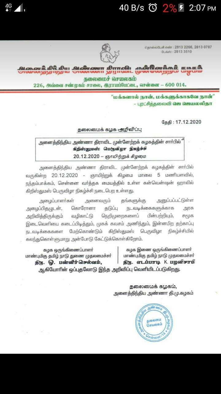 அதிமுக தலைமை கழகத்தின் சார்பில் கிறிஸ்துமஸ் பெருவிழா நிகழ்ச்சி வருகின்ற (20-12-2020) ஞாயிற்றுக்கிழமை மாலை 5 மணி அளவில் நந்தம்பாக்கம் சென்னை வர்த்தக மையத்தில் உள்ள கன்வென்ஷன் ஹாலில் கிறிஸ்துமஸ் பெருவிழா நிகழ்ச்சி நடைபெற உள்ளது.அழைப்பாளர்கள் அனைவரும் தங்களுக்கு அனுப்பப்பட்டுள்ள அழைப்பிதழுடன்