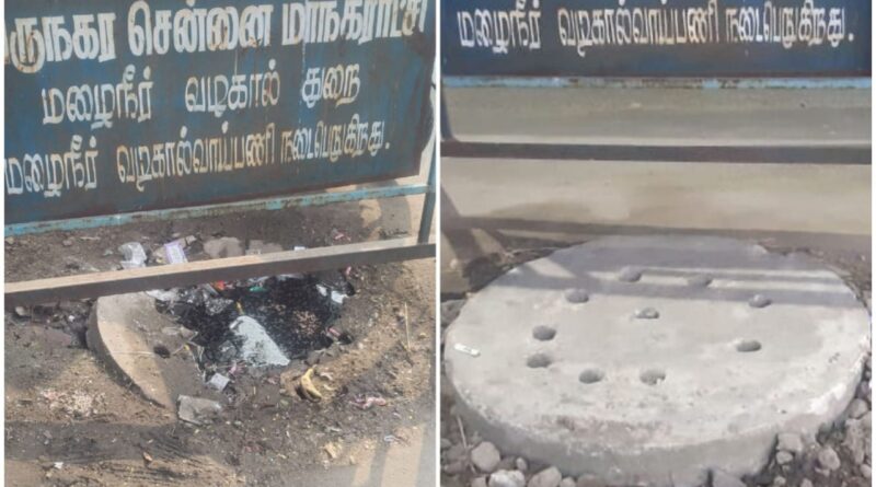 இதற்கு திரு, வடிவேல் அவர்கள் சம்பந்தப்பட்ட இடத்தை ஆய்வு கண்டு மற்ற மாநகராட்சி ஊழியர்கள் உதவியுடன் உடைந்த சாக்கடை கால்வாய் மூடியை அகற்றி புதிய கால்வாய் மூடி போடப்பட்டது.