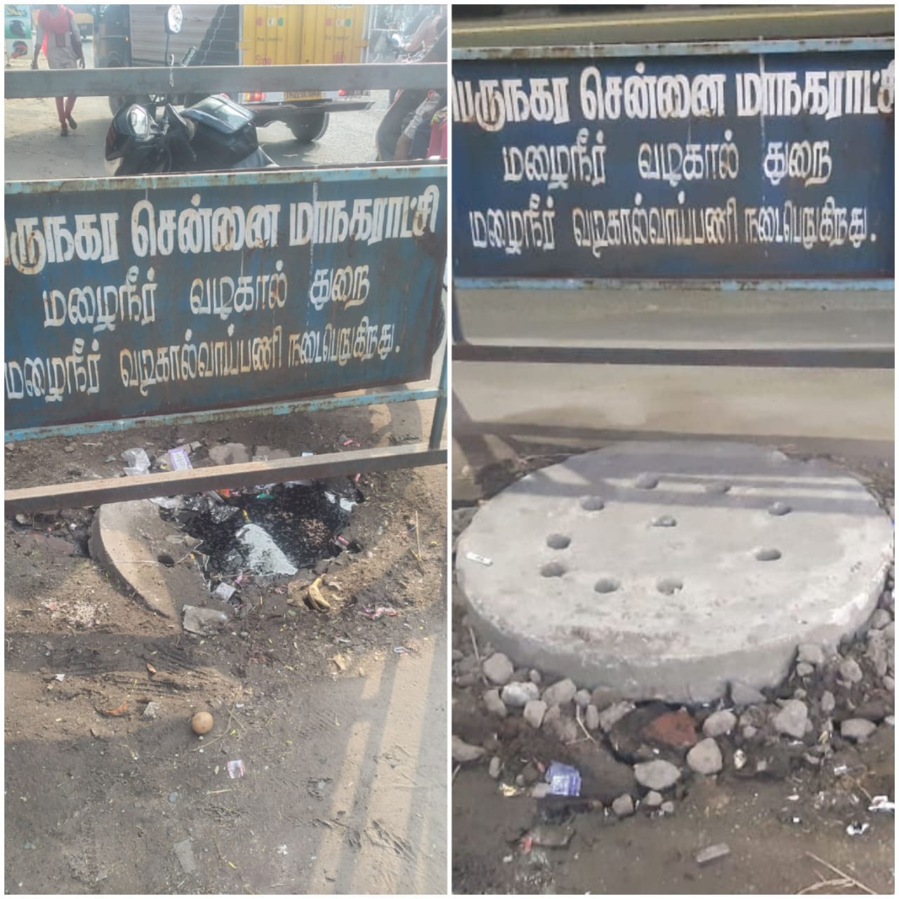 இதற்கு திரு, வடிவேல் அவர்கள் சம்பந்தப்பட்ட இடத்தை ஆய்வு கண்டு மற்ற மாநகராட்சி ஊழியர்கள் உதவியுடன் உடைந்த சாக்கடை கால்வாய் மூடியை அகற்றி புதிய கால்வாய் மூடி போடப்பட்டது.