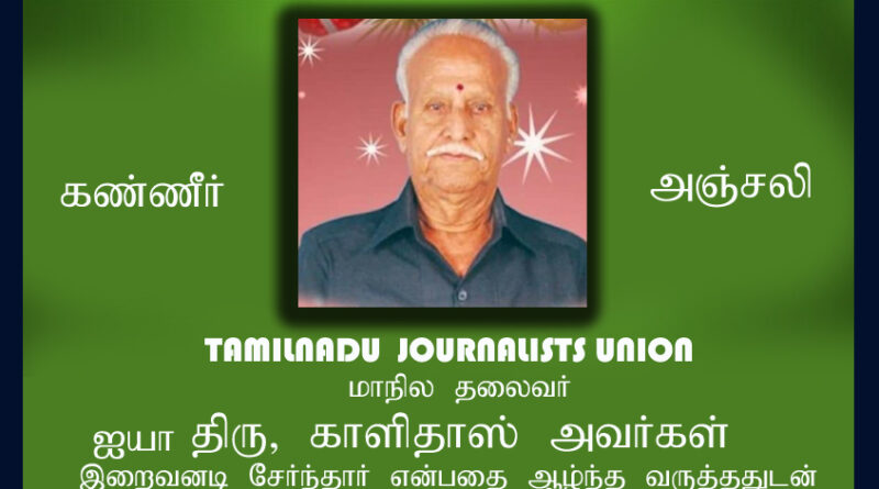 தமிழ்நாடு ஜர்னலிஸ்ட்ஸ் யூனியன் (TJU) மாநில தலைவர் மற்றும் மூத்த பத்திரிகையாளர்ஐயா திரு.காளிதாஸ் (வயது 83) நேற்று இரவு 11.40 மணியளவில் காலமானார். இன்று 12/12/2020 மாலை