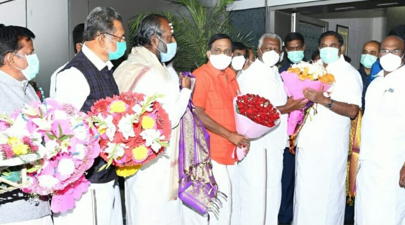 தமிழக முதல்வரை பூங்கொத்து கொடுத்து வரவேற்றனர்!