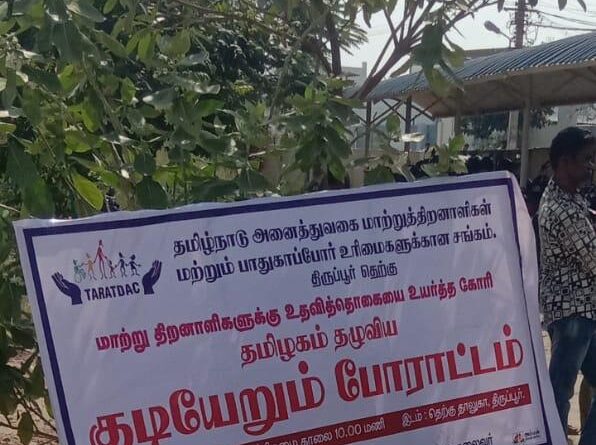 மாற்றுத்திறனாளிகள் போராட்டம் திருப்பூர் மாவட்டம் தாராபுரம் ரோட்டில் உள்ள செம்மந்தம் பாளையம் வட்டாட்சியர் அலுவலகத்தில் மாற்றுத்திறனாளிக்கான உதவித் தொகையை உயர்த்தக் கோரி மாற்றுத்திறனாளிகள் போராட்டம் நடைபெற்ற போது