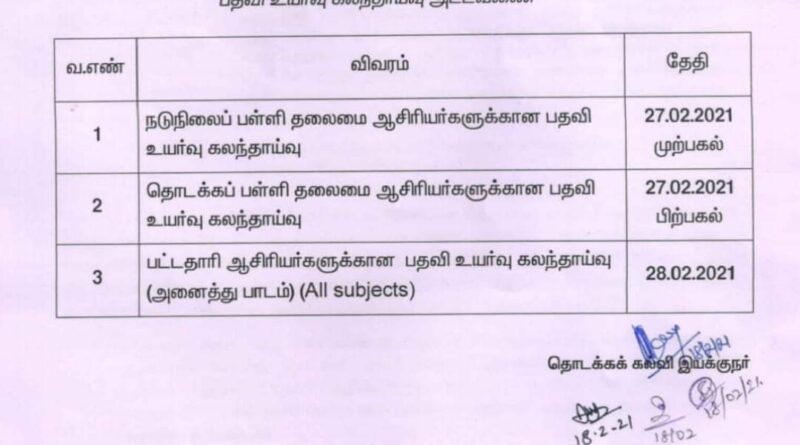 Read Moreவட்டாரக் கல்வி அலுவலர் : 26.02.2021 இடம்: இயக்குநர் அலுவலகம். சென்னை. நடுநிலைப் பள்ளி தலைமை ஆசிரியர் : 27.2.21 முற்பகல் தொடக்கப் பள்ளி தலைமை ஆசிரியர்: