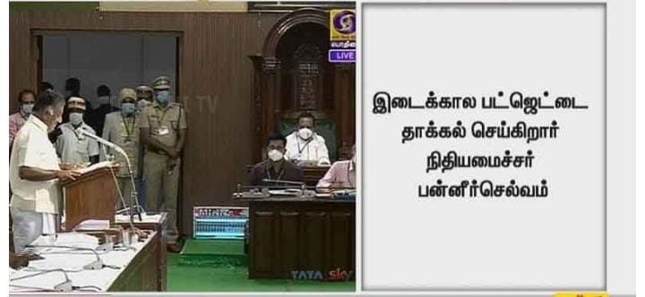 இதனை தொடர்ந்து, 2021-2022-ம் ஆண்டுக்கான இடைக்கால பட்ஜெட் தமிழக சட்டசபையில் நேற்று தாக்கல் செய்யப்பட்டது. சென்னை கலைவாணர் அரங்கத்தில் காலை 11 மணிக்கு சட்டசபை கூடியது. இதில் துணை முதல்-அமைச்சரும், நிதி அமைச்சருமான ஓ.பன்னீர்செல்வம் 2021-2022-ம் ஆண்டுக்கான இடைக்கால பட்ஜெட்டை தாக்கல் செய்து வருகிறார்.