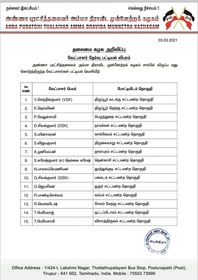 திருப்பூர் மாவட்டம் புரட்சித்தலைவர் அம்மா திராவிட முன்னேற்றக் கழகம்சார்பில்ஆலோசனை கூட்டம் மற்றும் வருகின்ற சட்டமன்ற தேர்தலில் போட்டியிடும் முதல் வேட்பாளர் பட்டியல் வெளியீடு.