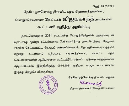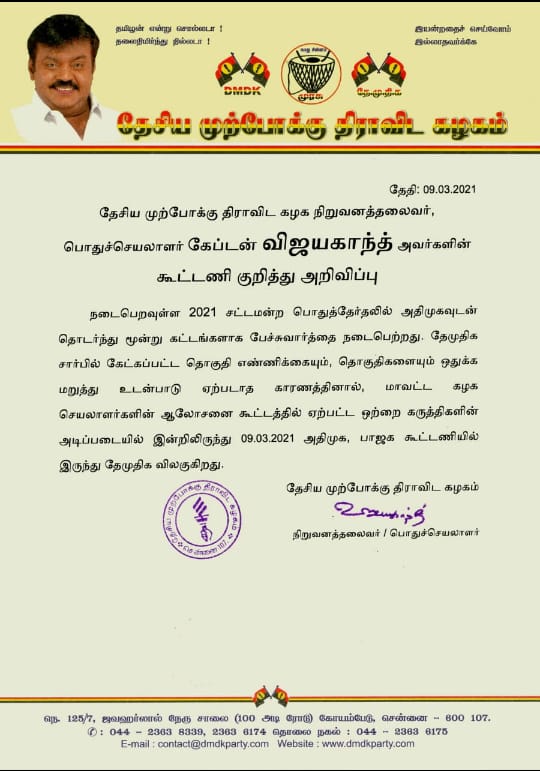 தொகுதி உடன்பாடு ஏற்படாத காரணத்தினால் அதிமுக கூட்டணியில் இருந்து தே.மு.தி.க. விலகல்!