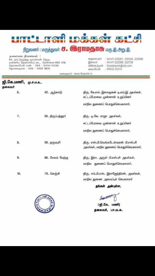 தமிழ்நாட்டில் சட்ட மன்ற தேர்தல் ஏப்ரல் 06.04.2021 அன்று நடைபெறவிருக்கும் சட்டப்பேரவைத் தேர்தலில், அ.இ.அ.தி.மு.க. தலைமையிலான கூட்டணியில் பாட்டாளி மக்கள் கட்சிக்கு 23 சட்டப்பேரவைத் தொகுதிகள் ஒதுக்கப்பட்டு உள்ளன. அவற்றில் கீழ்க்கண்ட 10 தொகுதிகளில் பாட்டாளி மக்கள் கட்சி சார்பில் போட்டியிடும் வேட்பாளர்களின் பெயர்கள் அடங்கிய முதல் பட்டியல் பா.ம.க. நிறுவனர் மருத்துவர் அய்யா அவர்கள், இளைஞரணித் தலைவர் மருத்துவர் அன்புமணி இராமதாஸ் ஆகியோரின் ஒப்புதலுடன் வெளியிடப்படுகிறது. வேட்பாளர்கள் விவரம்: வரிசை எண் தொகுதி எண் & பெயர் வேட்பாளர் பெயர் பென்னாகரம் ஜி.கே.மணி, சட்டப்பேரவை முன்னாள் உறுப்பினர் தலைவர், பாட்டாளி மக்கள் கட்சி ஆத்தூர் (திண்டுக்கல்) திருமதி. ம. திலகபாமா, பி.காம், பொருளாளர், பா.ம.க கீழ்ப்பென்னாத்தூர் மீ.கா. செல்வக்குமார் எம்.ஏ, அவர்கள், மாநில அமைப்பு செயலாளர். திருப்போரூர் திருக்கச்சூர் கி. ஆறுமுகம் பி. எஸ்.சி, சட்டப்பேரவை முன்னாள் உறுப்பினர் மாநில துணைப் பொதுச்செயலாளர். ஜெயங்கொண்டம் வழக்கறிஞர். கே. பாலு, பி.காம், பி.எல் வழக்கறிஞர்கள் சமூகநீதிப் பேரவைத் தலைவர் ஆற்காடு கே.எல். இளவழகன் டி.எம்.இ சட்டப்பேரவை முன்னாள் உறுப்பினர், மாநில துணைப் பொதுச்செயலாளர், திருப்பத்தூர் டி.கே. ராஜா சட்டப்பேரவை முன்னாள் உறுப்பினர் மாநில துணைப் பொதுச்செயலாளர், தருமபுரி எஸ்.பி.வெங்கடேஸ்வரன் பி.எஸ்.சி மாநில துணைப் பொதுச்செயலாளர், சேலம் மேற்கு இரா. அருள் பி.எஸ்.சி மாநில துணைப் பொதுச்செயலாளர், செஞ்சி திரு. எம்.பி.எஸ். இராஜேந்திரன், மாநில துணை அமைப்புச் செயலாளர்,