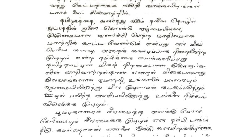 மக்கள் நீதி மய்யம் வேட்பாளர் கடிதம் மூலம் வாக்குகள் கேட்டு பிரச்சாரம்
