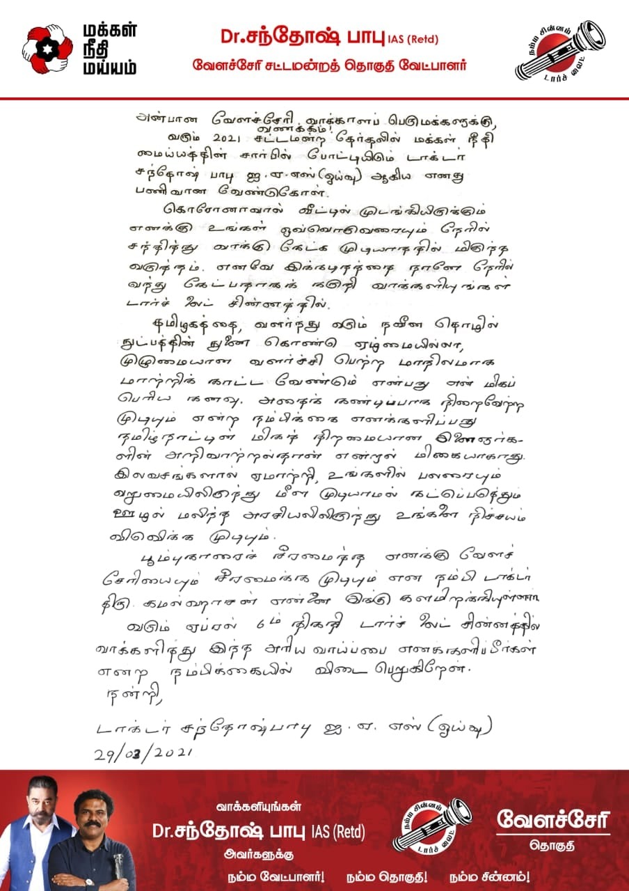 வேளச்சேரி தொகுதியின் மக்கள் நீதி மய்யம் வேட்பாளர் டாக்டர். சந்தோஷ் பாபு ஐ.ஏ.எஸ் [ஓய்வு] கடந்த சில நாட்களாக கொரோனாவினால் பாதிக்கப்பட்டு வெளியில் வரமுடியாத சூழ்நிலையில் கடிதம் மூலம் வாக்குகள் கேட்டு பிரச்சாரம் செய்து வருகிறார். பூம்புகாரை சீரமைத்த எனக்கு வேளச்சேரியையும் சீரமைக்க முடியும் என்று கொரோனவினால் அவதி பட்டு கொண்டும், கம்பீரமாய் வாக்கு கேட்டு டாக்டர். சந்தோஷ் பாபு ஐ.ஏ.எஸ் [ஓய்வு] கடிதத்தின் மூலம் தேர்தல் பிரச்சாரம் செய்து வருகிறார் என்பது குறிப்பிடத்தக்கது.