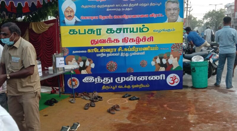 திருப்பூர் புதிய பேருந்து நிலையம் அருகில் இந்து முன்னணி வடக்கு ஒன்றியம் சார்பாக கபசுர கஷாயம் வழங்கும் நிகழ்ச்சி துவங்கிவைக்கப்பட்டது. இதை தமிழ் நாடு இந்து முன்னணி மாநில தலைவர் திரு.காடேஸ்வர சி. சுப்பிரமணியம் அவர்கள் தொடங்கி வைத்தார் தமிழ்மலர் மின்னிதழ் செய்திகளுக்காக செய்தியாளர் சங்கர்