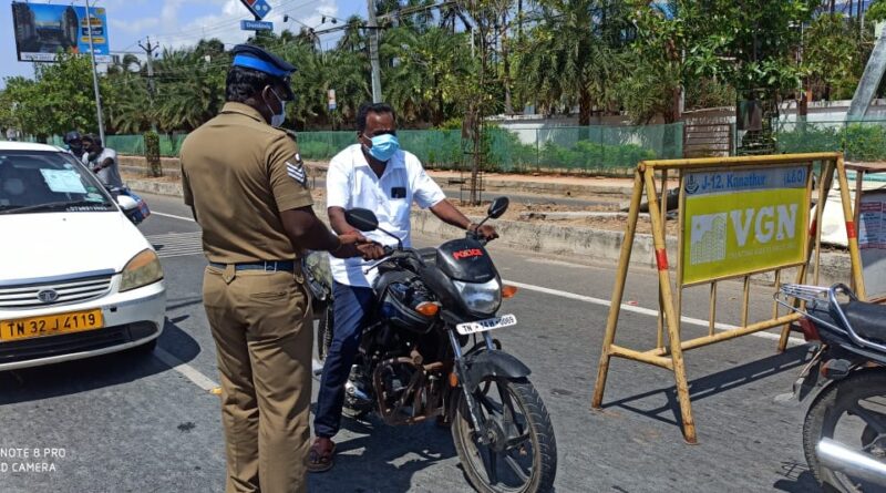 J-12 காவல் துணை ஆய்வாளர் பி. லாசர் அவர்கள் முன்னிலையில் , தலைமை காவலர் செந்தில் வேல் அவர்கள் தலைமையில் வாகன சோதனையில் ஈடுபட்டனர். மருத்துவ அவசரம் இறுதி காரியம் போன்ற காரணங்களுக்காக செல்வோருக்கு மட்டும் அனுமதி அளித்தனர், இந்நிலையில் தகுந்த