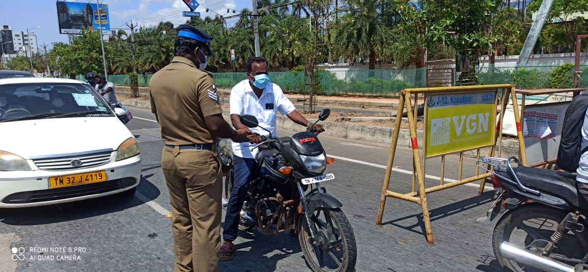 J-12 காவல் துணை ஆய்வாளர் பி. லாசர் அவர்கள் முன்னிலையில் , தலைமை காவலர் செந்தில் வேல் அவர்கள் தலைமையில் வாகன சோதனையில் ஈடுபட்டனர். மருத்துவ அவசரம் இறுதி காரியம் போன்ற காரணங்களுக்காக செல்வோருக்கு மட்டும் அனுமதி அளித்தனர், இந்நிலையில் தகுந்த