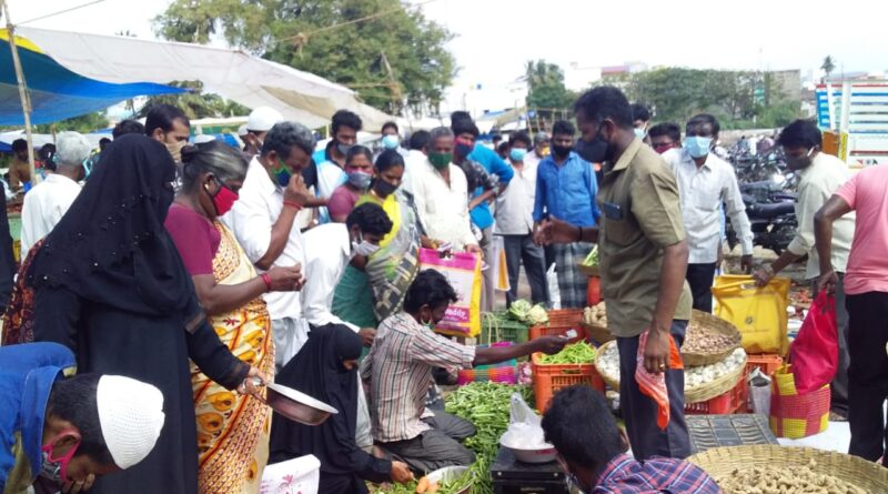 திருப்பத்தூர் மாவட்டம் வாணியம்பாடி சந்தை மார்க்கெட்டில் காய்கறி மற்றும் இறைச்சி கடைகளில் மக்கள் கூட்டம் அதிகரித்தும் மக்கள் சமூக இடைவெளியை பின்பற்றாமலும் முக கவசங்களை அணியாமலும் உயிர் மீது பயம் இல்லாமலும் கூட்டமாக கூடி காய்கறி இறைச்சி மற்றும் மளிகை பொருட்களை வாங்கி செல்கின்றனர். கரோனா வைரஸின் கோர தாண்டவத்தை மக்கள் உணர்ந்தும் அலட்சியமாக இருப்பது பெரும் கவலையளிக்கிறது. தமிழ் மலர் மின்னிதழ்.செய்தியாளர்.P.Suresh.vaniyambadi.