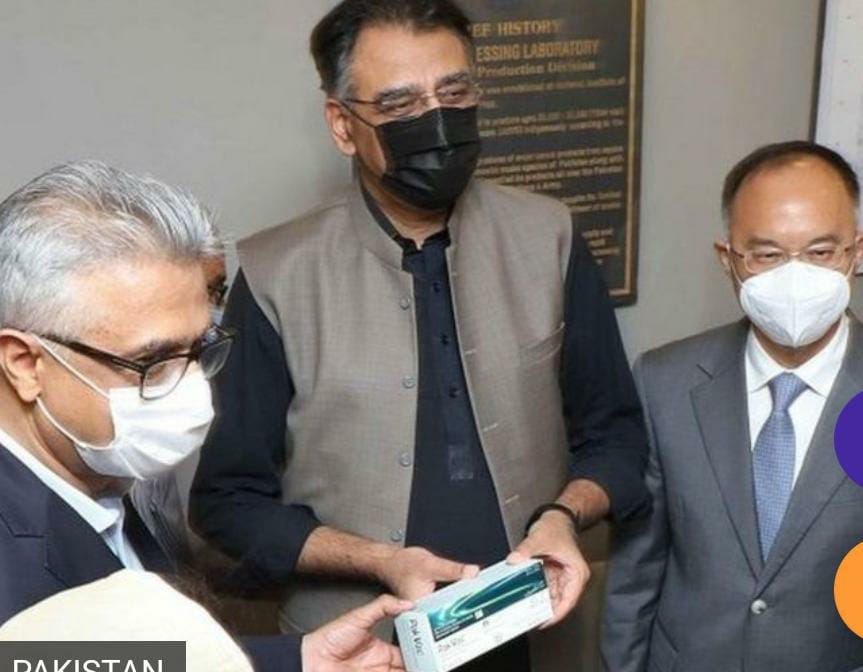 சீனா உதவியுடன் பாகிஸ்தான் தயாரித்த கொரோனா தடுப்பூசி; PAK VAC, ‘இன்குலாப்’ என பெயர் சூட்டியதுபாகிஸ்தானின் திட்ட அமைச்சர் அசத் உமர் (நடுவில்), மருத்துவர் ஃபைசல் சுல்தான், மற்றும் சீன அதிகாரி ஆகியோர் தடுப்பூசியை அறிமுகப்படுத்தினர்.