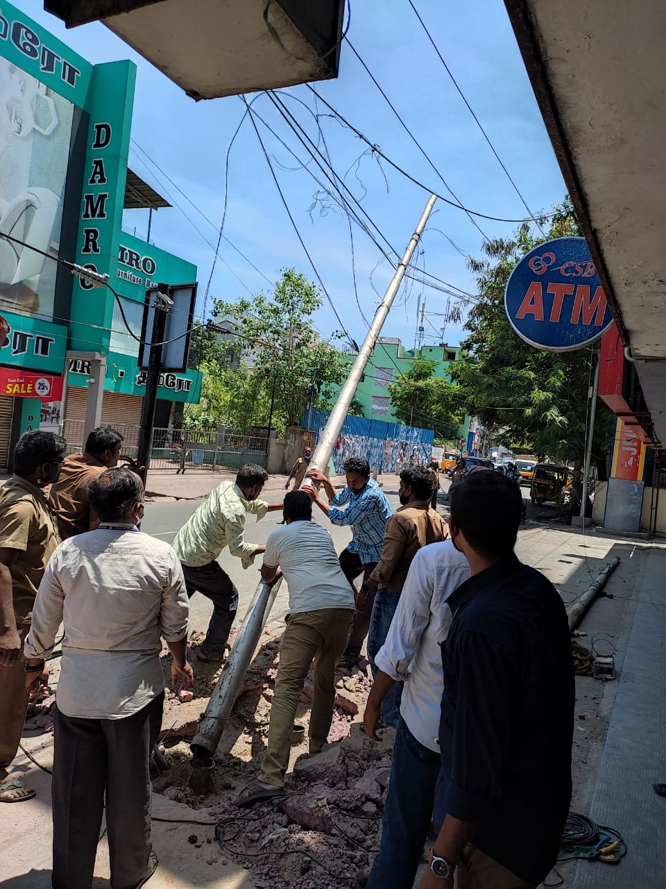 பழுதடைந்த மின் விளக்கு கம்பத்தை அகற்றினர்