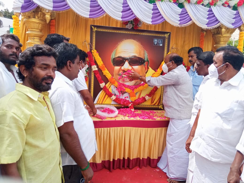 K. செல்வராஜ் ஒன்றிய பொதுக்குழு உறுப்பினர் முன்னிலையில் மறைந்த முன்னாள் முதல்வர் முத்தமிழ் அறிஞர் கலைஞர் கருணாநிதி திரு உருவ படத்திற்கு மலர் தூவி மரியாதை செய்தார்கள்,