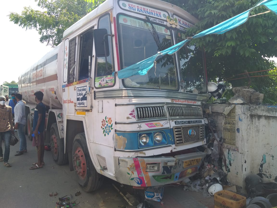 செங்கல்பட்டு மாவட்டம் பல்லாவரத்தில் இருந்து ஏர்போர்ட் செல்லும் நெடுஞ்சாலையில் (09/09/2021) வியாழக்கிழமை மதியம் 2.00p.m மணி அளவில் ஆயில் ஏற்றி வந்த டேங்கர் லாரி கட்டுப்பாட்டை இழந்து சாலையோரத்தில் தலைக்கவசம், முகக் கண்ணாடி முககவசம், விற்பனை செய்து வந்த நபர் மீது மோதி விபத்துக்குள்ளானது.