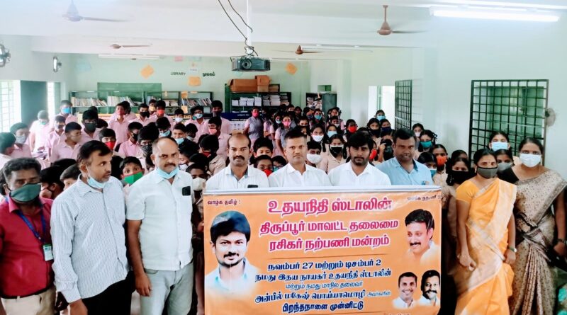 உதயநிதி ஸ்டாலின் மற்றும் நமது உதயநிதி ஸ்டாலின் ரசிகர் நற்பணி மன்றம் மாநிலத் தலைவர் அன்பில் மகேஷ் பொய்யாமொழி அவர்களின் பிறந்தநாளை முன்னிட்டு தமிழகம் முழுவதும் நவம்பர் 1 முதல் தொடர் பல்வேறு நிகழ்ச்சிகள் நடைபெற்று வருகின்றது அதனைத் தொடர்ந்து திருப்பூர் மாவட்டம் தலைமை ரசிகர் நற்பணி மன்றம் மாவட்டத் தலைவர் என் எஸ் கே சிவகுமார் தலைமையில் ஒரு லட்சம் குழந்தைகளை நேரடியாக சந்தித்து அவர்களுக்கு மரக்கன்றுகளை விதைகளைக் கொடுத்து மற்றும் கவர்களை கொடுத்து அதனை வளர்ப்பு முறை கற்றுக் கொடுத்து மூன்று மாதத்திற்குள் ஒரு லட்சம் மரக்கன்று திரும்பப் பெற்று நமது மாநில அரசிற்கு கொடுப்பதாக முடிவு செய்யப்பட்டது அதன் ஒரு பகுதியாக நேற்று பல்லடம் தொகுதியில் பொங்கலூர் பகுதியில் காட்டூர் அரசினர் பள்ளி குழந்தைகளுடன்