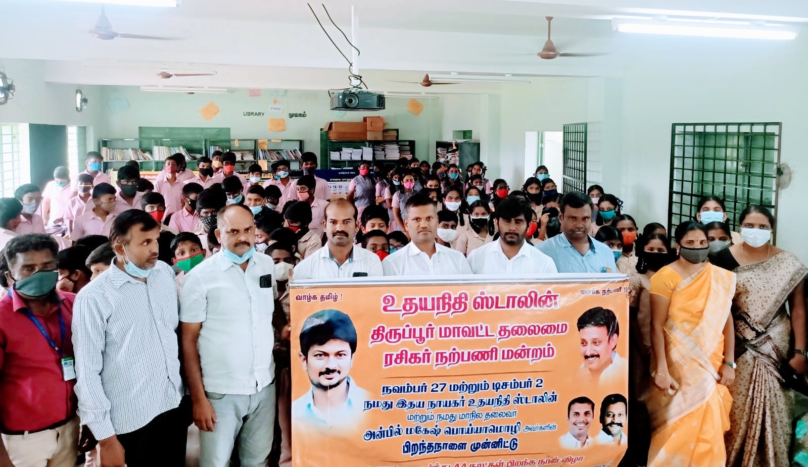 உதயநிதி ஸ்டாலின் மற்றும் நமது உதயநிதி ஸ்டாலின் ரசிகர் நற்பணி மன்றம் மாநிலத் தலைவர் அன்பில் மகேஷ் பொய்யாமொழி அவர்களின் பிறந்தநாளை முன்னிட்டு தமிழகம் முழுவதும் நவம்பர் 1 முதல் தொடர் பல்வேறு நிகழ்ச்சிகள் நடைபெற்று வருகின்றது அதனைத் தொடர்ந்து திருப்பூர் மாவட்டம் தலைமை ரசிகர் நற்பணி மன்றம் மாவட்டத் தலைவர் என் எஸ் கே சிவகுமார் தலைமையில் ஒரு லட்சம் குழந்தைகளை நேரடியாக சந்தித்து அவர்களுக்கு மரக்கன்றுகளை விதைகளைக் கொடுத்து மற்றும் கவர்களை கொடுத்து அதனை வளர்ப்பு முறை கற்றுக் கொடுத்து மூன்று மாதத்திற்குள் ஒரு லட்சம் மரக்கன்று திரும்பப் பெற்று நமது மாநில அரசிற்கு கொடுப்பதாக முடிவு செய்யப்பட்டது அதன் ஒரு பகுதியாக நேற்று பல்லடம் தொகுதியில் பொங்கலூர் பகுதியில் காட்டூர் அரசினர் பள்ளி குழந்தைகளுடன்