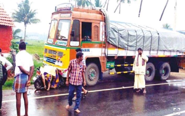 லாரி மீது ஸ்கூட்டர் மோதி விபத்து.