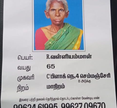 தாய் காணவில்லை மகன்கள் பரிதவிப்பு. சோழிங்கநல்லூர் தொகுதிக்கு உட்பட்ட பெரும்பாக்கம் எழில் நகர் பகுதியில் வசித்து வந்த வள்ளி அம்பாள் வயது 65 அவர் சில தினங்களுக்கு