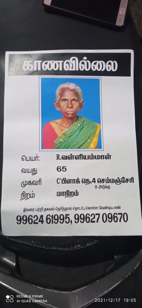 தாய் காணவில்லை மகன்கள் பரிதவிப்பு. சோழிங்கநல்லூர் தொகுதிக்கு உட்பட்ட பெரும்பாக்கம் எழில் நகர் பகுதியில் வசித்து வந்த வள்ளி அம்பாள் வயது 65 அவர் சில தினங்களுக்கு முன்பு குன்றத்தூரில் வசித்து வந்த தன் மகன் அவருடைய வீட்டிற்குச் சென்றார் அங்கிருந்து சில நாட்களாக காணவில்லை என்று அவருடைய மகன் தெரிவித்தார் இதனைத் தொடர்ந்து வள்ளியம்மாள் அவருடைய மகன் காவல் நிலையத்தில் புகார் அளிக்கப் பட்டுள்ளார்