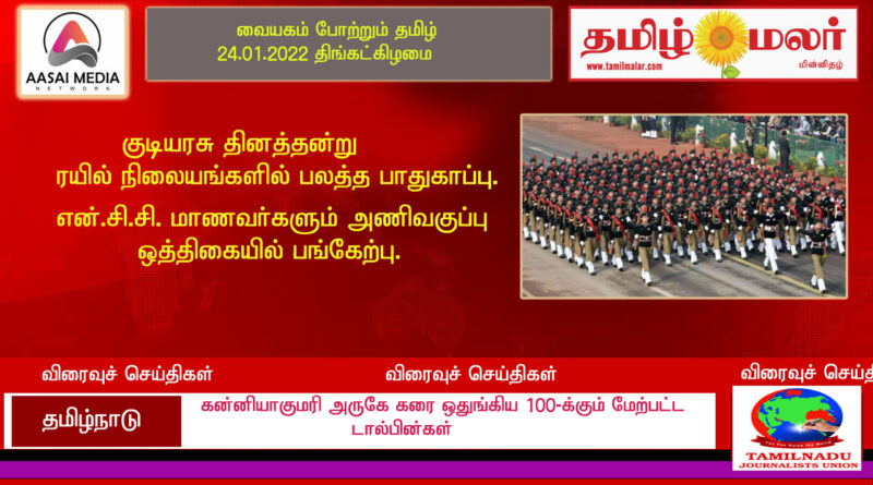 குடியரசு தினத்தன்று, ரயில் நிலையங்களில் பலத்த பாதுகாப்பு; என். சி. சி. மாணவர்களும் அணிவகுப்பு ஒத்திகையில் பங்கேற்பு. கன்னியாகுமரி அருகே கரை ஒதுங்கிய 100-க்கும் மேற்பட்ட டால்பின்கள்.