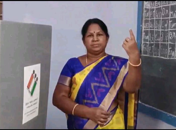 திருப்பூர் தாராபுரத்தில் என் சின்னச்சாமி நகராட்சி மேல்நிலைப் பள்ளியில் ஆதிதிராவிடர் மற்றும் பழங்குடியினர் அமைச்சர் கயல்விழி செல்வராஜ் நேற்று தனது கணவருடன் சென்று வாக்குப் பதிவு செய்தார் தமிழ் மலர் மின்னிதழ் செய்திக்காக திருப்பூர் மாவட்ட முதன்மை செய்தியாளர் பாக்கியராஜ்