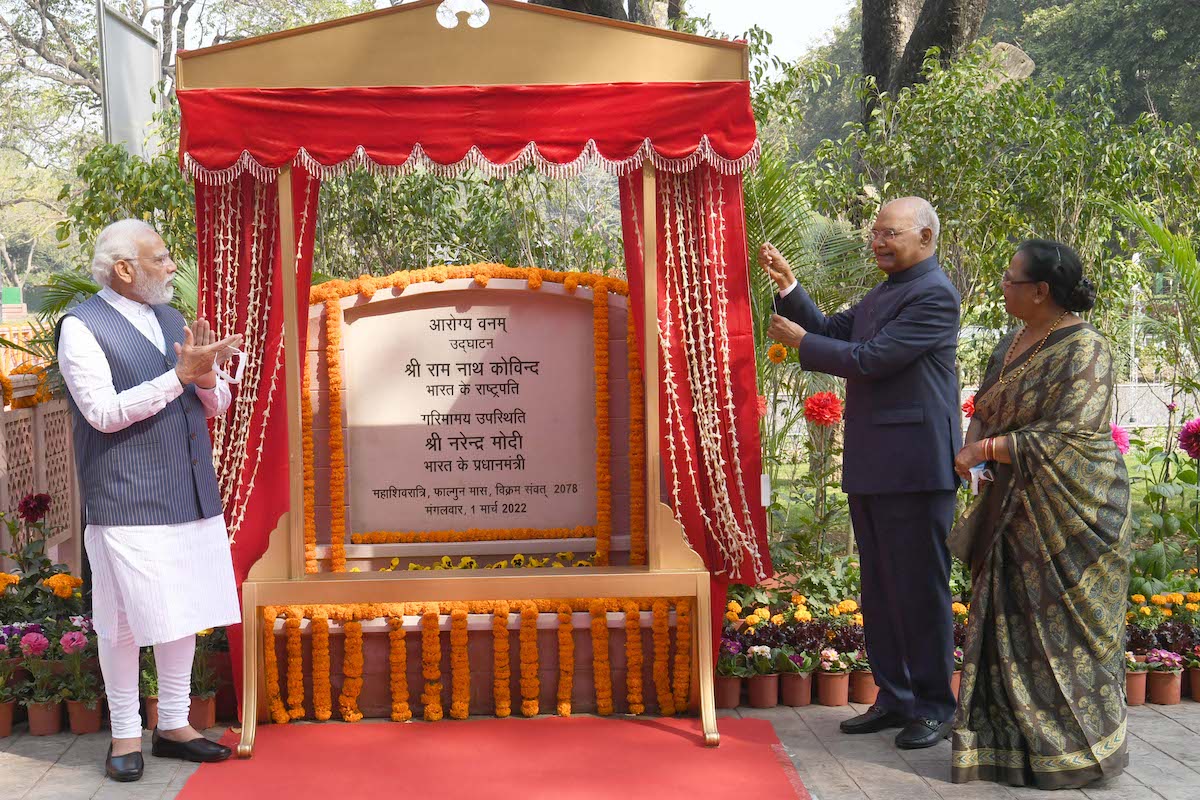 குடியரசுத் தலைவர் மாளிகையில் புதிதாக உருவாக்கப்பட்டுள்ள ஆரோக்கிய வனத்தை பிரதமர் நரேந்திர மோடி முன்னிலையில் ஜனாதிபதி ராம்நாத் கோவிந்த் திறந்து வைத்தார்.