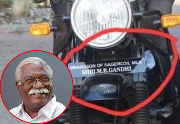 கன்னியாகுமரி மாவட்டம் நாகர்கோவில் தொகுதி எம்.எல்.ஏ.வாக பா.ஜ.வை சேர்ந்த எம்.ஆர்.காந்தி (77) உள்ளார். திருமணம் செய்து கொள்ளாமல் பொது வாழ்க்கைக்கு தன்னை அர்ப்பணித்துக் கொண்டவர்.இளைஞர் ஒருவர் தன் பைக்கில் பதிவு எண் இருக்க வேண்டிய இடத்தில் ‘எம்.எல்.ஏ. – எம்.ஆர்.காந்தியின் பேரன்’ என ஆங்கிலத்தில் எழுதப்பட்ட பலகையை பொருத்தியுள்ளார்.