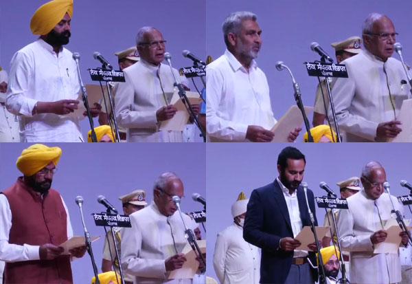 பஞ்சாபில் ஆம் ஆத்மி அமோக வெற்றி பெற்றதை தொடர்ந்து, கடந்த 16ல் பக்வந்த் மான் முதல்வராக பதவியேற்று கொண்டார். அதற்கு அடுத்த நாள் எம்.எல்.ஏ.,க்கள் அனைவரும் பதவியேற்றனர். அவர்களுக்கு இடைக்கால சபாநாயகர் இந்தர்பிர் சிங் பதவிப்பிரமாணம் செய்து வைத்தார். பஞ்சாப் அமைச்சரவையில், முதல்வரையும் சேர்த்து 18 பேர் அமைச்சர்களாக நியமிக்க முடியும். இன்று(மார்ச் 19) அமைச்சரவை விரிவாக்கம் செய்யப்பட்ட நிலையில், 10 பேர் அமைச்சர்களாக பதவியேற்று கொண்டனர். இன்று, ஹர்பல் சிங், பல்ஜித் கவுர், ஹர்பஜன் சிங் இடோ, விஜய் சிங்லா, லால் சந்த், குர்மீத் சிங், குல்தீப் சிங், லால்ஜித் சிங் புலர், பிரஹம் சங்கர், ஹர்ஜோத் சிங் ஆகியோர் அமைச்சர்களாக பதவியேற்றனர். அவர்களுக்கு கவர்னர் பன்வாரிலால் பதவிப்பிரமாணம் செய்து வைத்தார்.