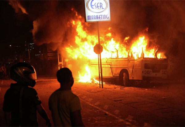 கொழும்பு: இலங்கை அதிபர் கோத்தபய ராஜபக்சேவுக்கு எதிராக போராடிய போராட்டக்காரர்கள் கொழும்புவில் உள்ள அவரது வீட்டை முற்றுகையிட்டனர்; போலீஸ் பஸ் தீ வைத்து கொளுத்தப்பட்டதால் பெரும் பரபரப்பு ஏற்பட்டது. இதனையடுத்து கொழும்பு நகரில் ஊரடங்கு அமல்படுத்தப்பட்டுள்ளது. இலங்கையில், அந்நிய செலாவணி கையிருப்பு வீழ்ச்சியால், கடும் பொருளாதார நெருக்கடி ஏற்பட்டுள்ளது. இதனால், பெட்ரோல், டீசல், சமையல் ‘காஸ்’ உள்ளிட்ட எரிபொருட்களின் விலை உயர்ந்து, மக்கள் பெரும் சிரமத்திற்கு ஆளாகி உள்ளனர். எரிபொருள் பற்றாக்குறையால், நீர் மின் நிலையங்கள் இயங்க முடியாத நிலை ஏற்பட்டுள்ளது. இதனால், மின்சார வினியோகம் தடைபட்டு, மின் வெட்டு நேரத்தை தினமும் 13 மணி நேரமாக, இலங்கை அரசு உயர்த்தியது. இந்நிலையில், இலங்கை அரசுக்கு எதிராக கொழும்புவில் மக்கள் நேற்று மாலை ஆர்ப்பாட்டத்தில் ஈடுபட்டனர். அதிபர் கோத்தபய ராஜபக்சே பதவி விலகக்கோரி, கொழும்புவில் உள்ள அவரது இல்லத்தை சுமார் 5 ஆயிரத்துக்கும் அதிகமானோர் முற்றுகையிட முயன்றதால் பெரும் பரபரப்பு ஏற்பட்டது. போலீசாருடன் அவர்கள் மோதல் போக்கை கடைபிடித்ததையடுத்து, துணை ராணுவ படை குவிக்கப்பட்டது. அங்கிருந்த தடுப்பு வேலிகளை அகற்றியும், போலீஸ் மீது கல் வீச்சிலும் ஈடுபட, போராட்டம் வன்முறையாக மாறியது. அங்கிருந்த போலீஸ் வாகனம் தீ வைத்து கொளுத்தப்பட்டது.