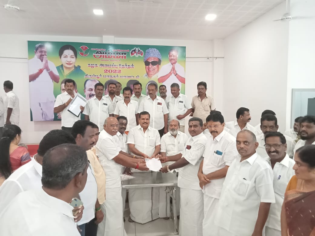 திருப்பூர் மாநகர் மாவட்ட கழக அமைப்பு தேர்தல் 2022 மாவட்ட செயலாளர்கள் பொறுப்பாளர்கள் தேர்தல் திருப்பூர் ஐஸ்வர்யா மகாலில் நடைபெற்றது அதில் சென்னிமலை முன்னாள் பேரூராட்சி தலைவர் ஜம்பு என்கிற சண்முகசுந்தரம் அவர்கள் மாவட்ட துணை செயலாளர் பொறுப்பிற்கு வேட்பு மனு தாக்கல் செய்தார்.