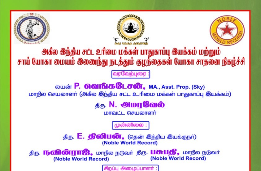 இந்த நிகழ்வானது நோபல் புக் ஆப் வேர்ல்ட் ரெக்கார்ட் அன்று அமைப்பின் முன்னிலையில் உலக சாதனை நிகழ்வு நடைபெற உள்ளதால் அனைவரும் நேரத்தை சரியான முறையில் கடைபிடித்து வருகை தர வேண்டும் என்று உங்களை வேண்டி விரும்பி கேட்டுக் கொள்கிறோம்