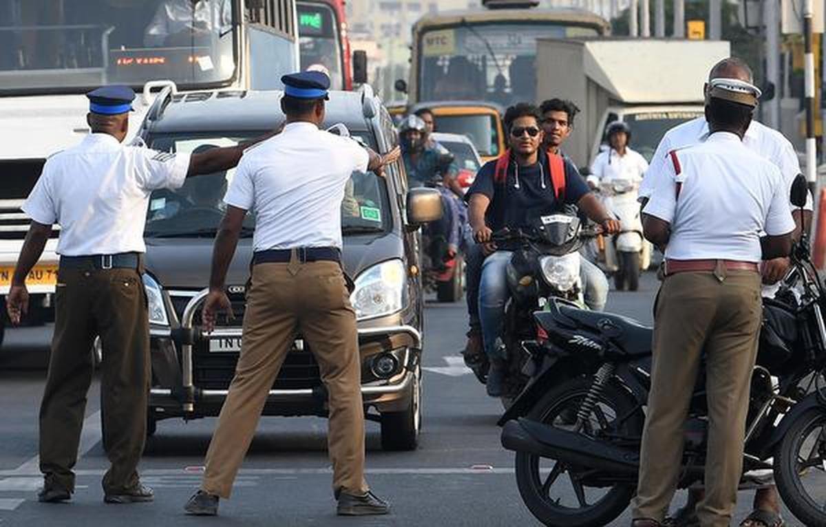சென்னையில் விபத்து ஏற்படும் பகுதியை தெரிவிக்க விபத்து தொடர்பான குற்றவியல் சட்ட பிரிவுகளை சாலையில் வட்ட வடிவ குறியீடாக வரைந்து வாகன ஓட்டிகளுக்கு போக்குவரத்து காவல்துறை எச்சரிக்கை