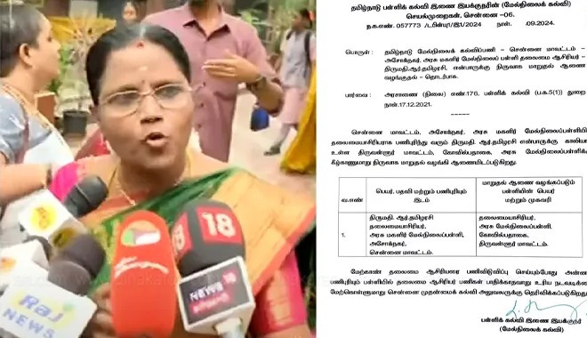 Read Moreசென்னை அசோக் நகர் அரசு மகளிர் மேல்நிலைப்பள்ளி தலைமை ஆசிரியை தமிழரசி, திருவள்ளூர் மாவட்டத்திற்கு பணியிட மாற்றம் செய்து பள்ளிக்கல்வித்துறை உத்தரவு பிறப்பித்துள்ளது. தலைமை ஆசிரியர் தமிழரசி