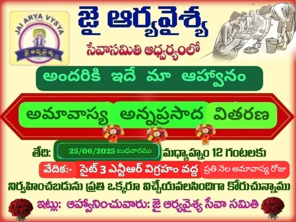 జూన్ 25వ తారీకు అమావాస్య రోజు సైట్ 3 లో అమావాస్య అన్న ప్రసాద వితరణ కార్యక్రమం దిగ్విజయం చేయడం జరిగినది ఈ కార్యక్రమం లో ముఖ్య అతిథులుగా మల్కాజ్గిరి మెడికల్ డిస్ట్రిక్ట్ ప్రెసిడెంట్ వేణుగోపాల్ శర్మగారు, ట్రెజరర్ బెజ్జాల నాగరాజ్ గుప్తా గారు, మరియు వాసవి కిరణాలు త్రినాధ్ గారు , వచ్చినారు వారి యొక్క అమూల్యమైన సందేశాన్ని అందించినారు వారికి అభినందనలు తెలియజేయుచున్నాము . మోతి నగర్, బోరబండ, సైట్ 3, మూడు ప్రదేశాలలో రెండు బ్రాంచీలలో ఒక వెయ్యి మంది పేద నిరుపేద కార్మికులకు అన్న ప్రసాదం అందించడం జరిగినది ఈ కార్యక్రమానికి సహకరించిన జై ఆర్యవైశ్య మిత్రులందరికీ పేరుపేరునా వారికి అభినందనలు తెలియజేస్తూ వారి యొక్క కుటుంబ సభ్యులందరికీ వాసవి మాత ఆశీర్వాదములు ఎల్లవేళలా ఉండాలని కోరుకొనుచున్నాము మరియు రెండు బ్రాంచీలు మెయింటెనెన్స్ చేయడం చాలా చాలా గ్రేట్ నిజంగా మరోసారి మీ అందరికీ జై ఆర్యవైశ్య సేవా సమితి తరపున ప్రత్యేక ధన్యవాదాలు తెలియ చేస్తున్నాము.